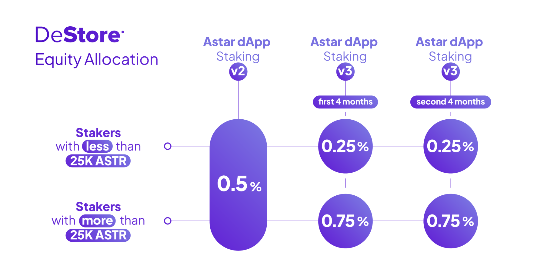 - Stakers with more than 25,000 ASTR, staked with DeStore for the duration of the term, will receive 0.75% of the Equity allocation based on their contribution to the pool.